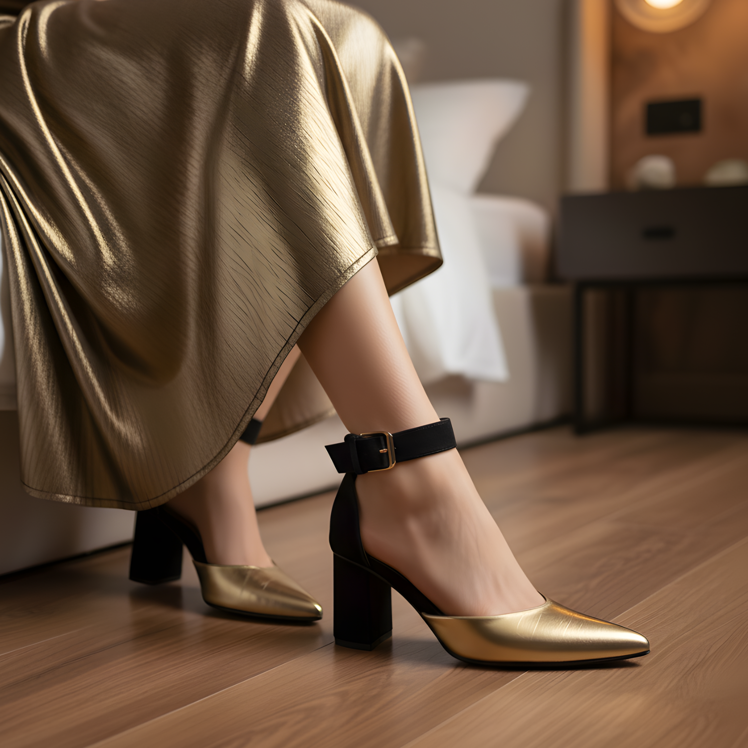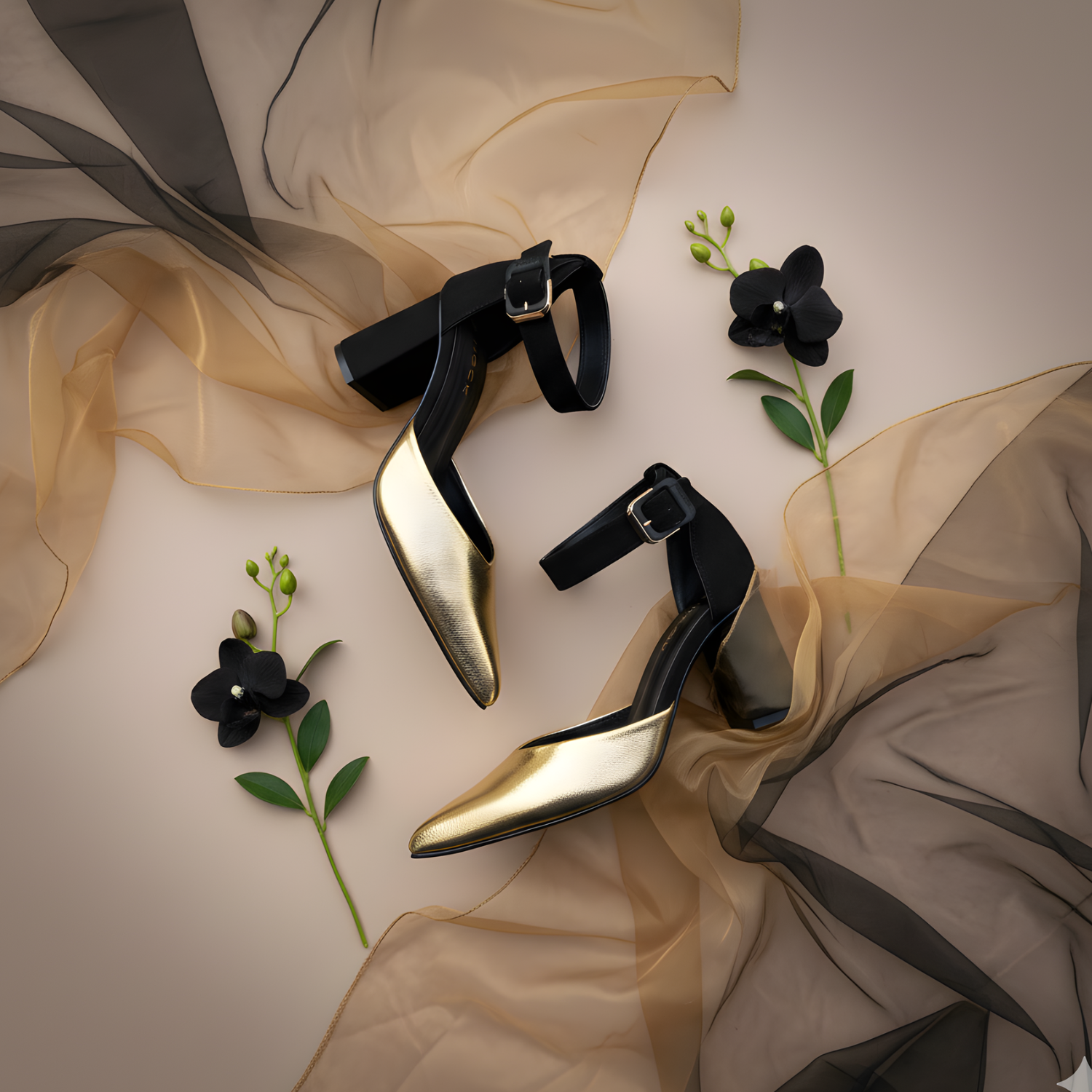 The HockShoes mule sandal is a harmonious blend of gold and black, symbolizing power and grace. The gleaming gold upper radiates warmth and opulence, while the contrasting black ankle strap adds a touch of authority and modernity.