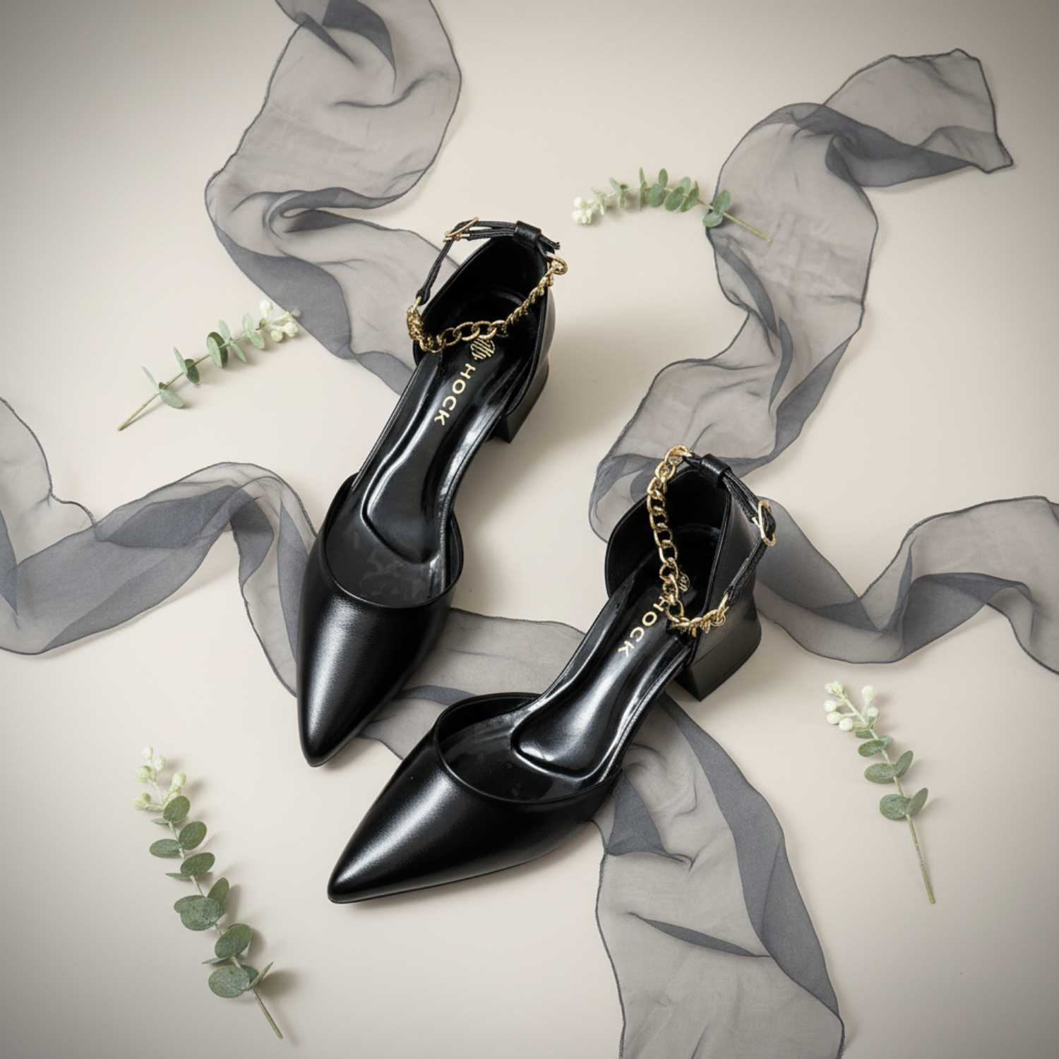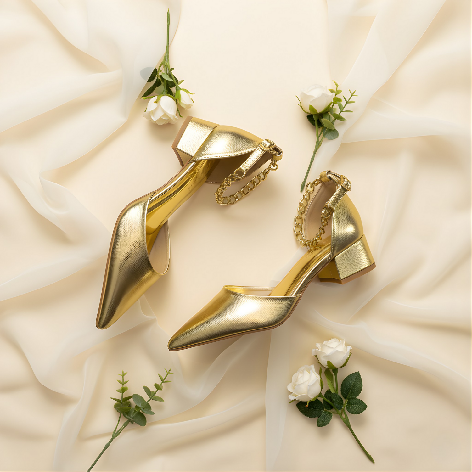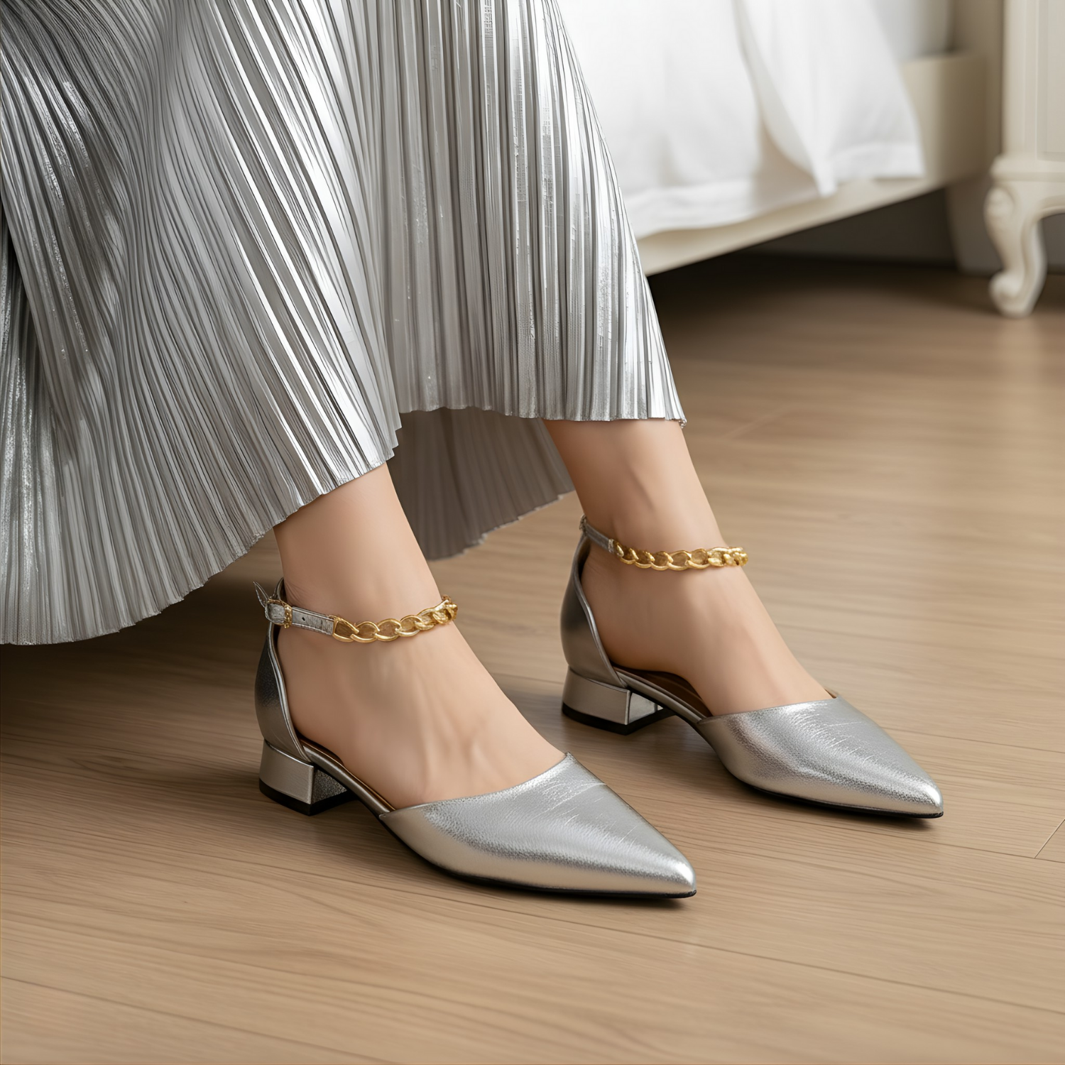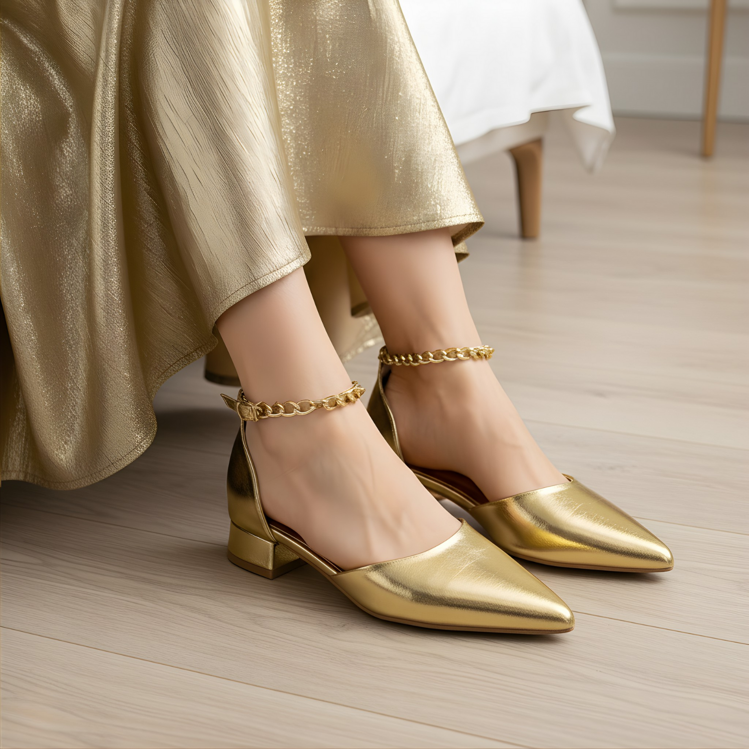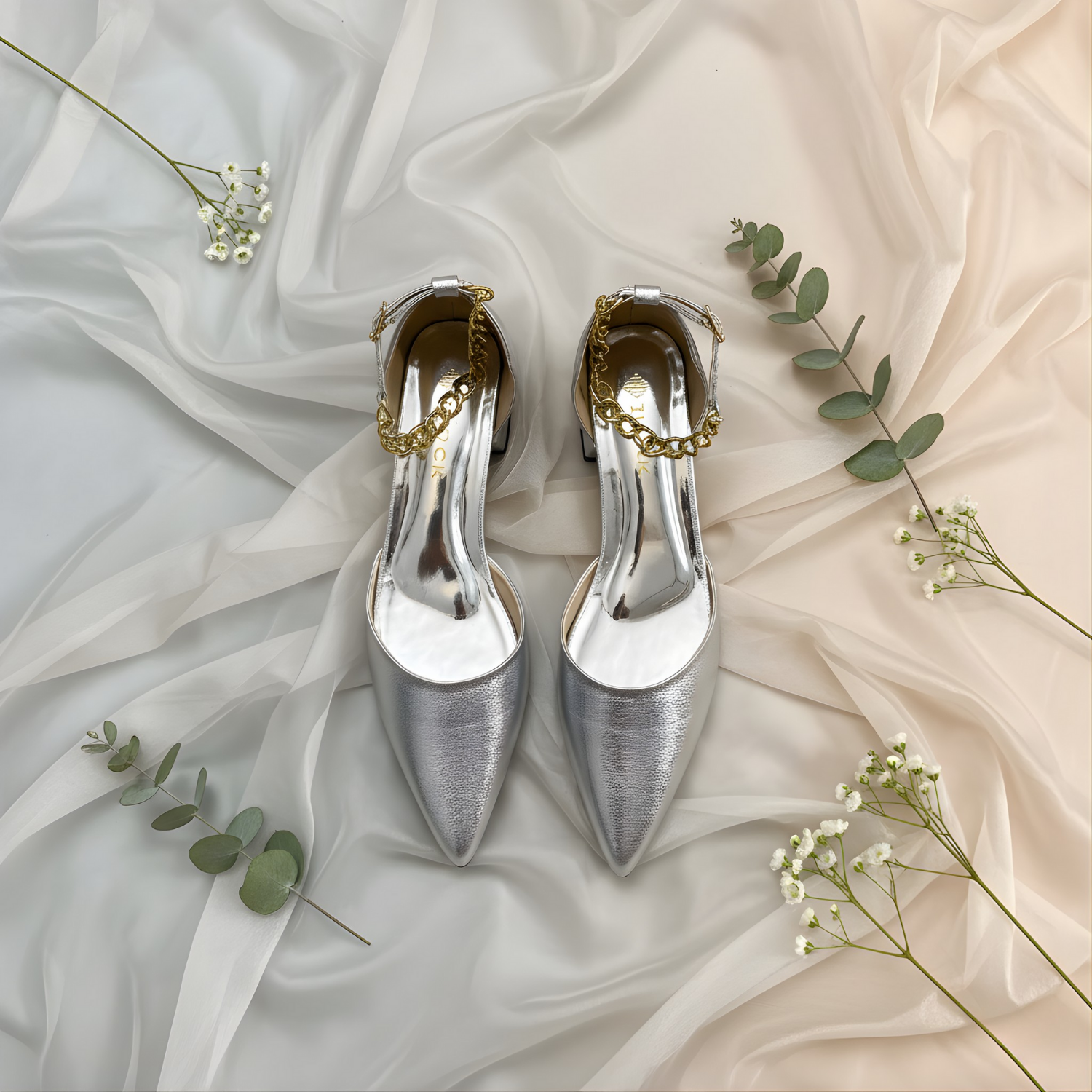 The gold chain element is not just a decorative feature—it symbolizes connection and strength, a reminder of the modern woman’s resilience and elegance. When paired with the fluidity of the metallic skirt in the image, the mules exude a poetic synergy between movement and structure.